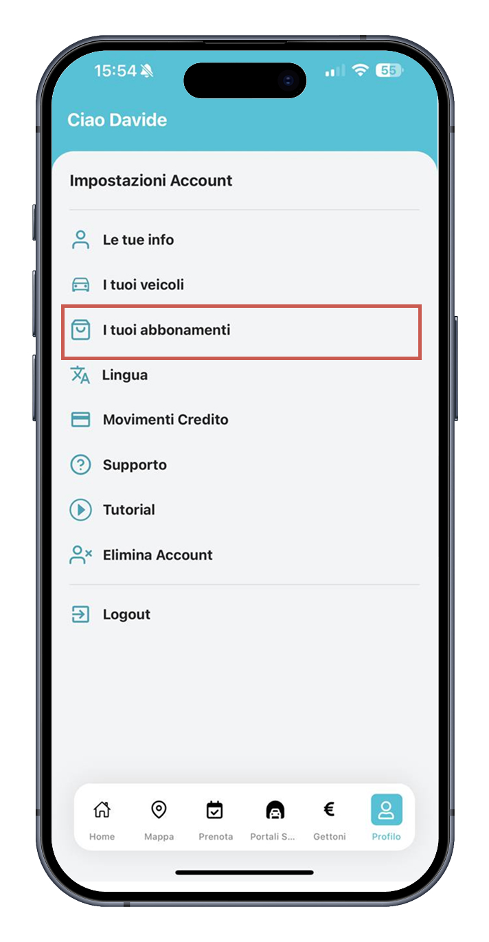 Al primo accesso potrai cliccare sul tasto inizia e l'app ti porterà direttamente alla sezione profilo. Oppure se non hai aggiunto il voucher ma sei al tuo secondo accesso, clicca su profilo. Una volta aperto il tuo profilo clicca su "I tuoi veicoli".