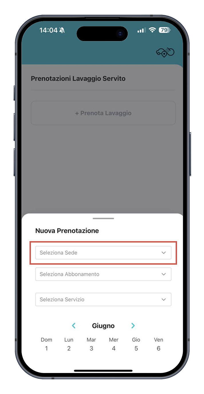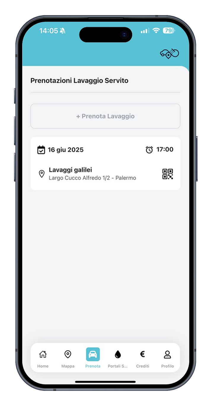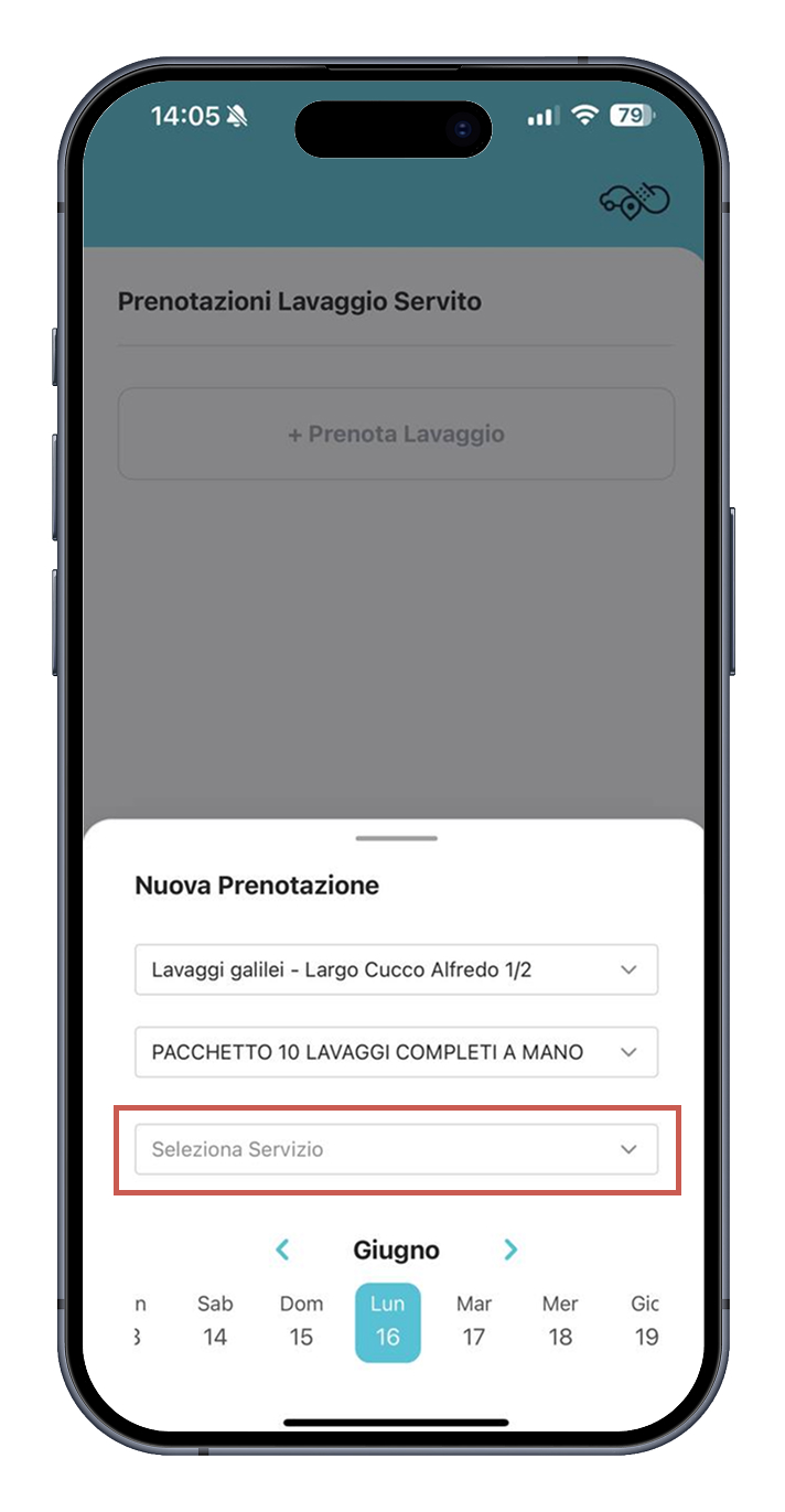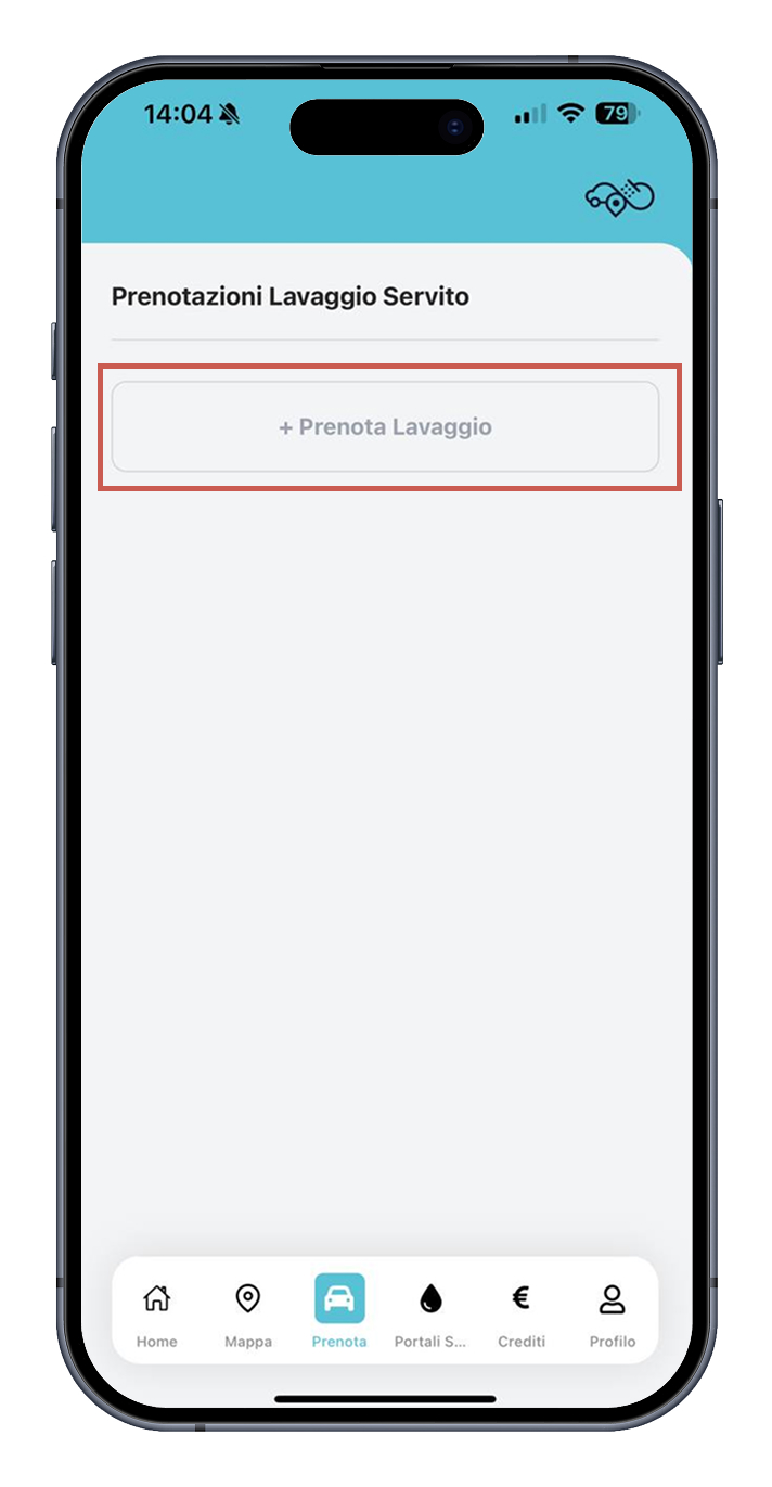 Clicca sulla barra di navigazione "Prenota", si aprirà la sezione per prenotare un lavaggio servito. Cliccando su "Prenota Lavaggio" verrà mostrata la finestra dove inserire le informazioni per la prenotazione.