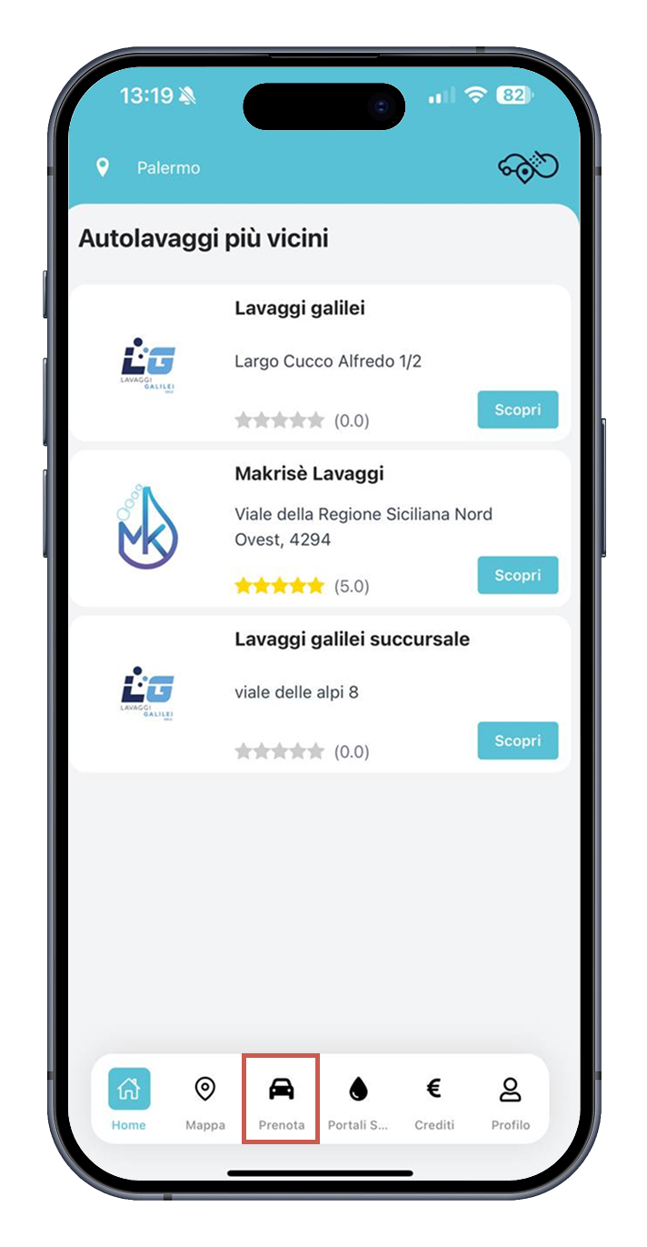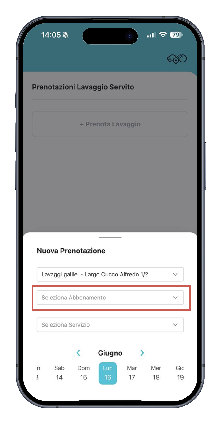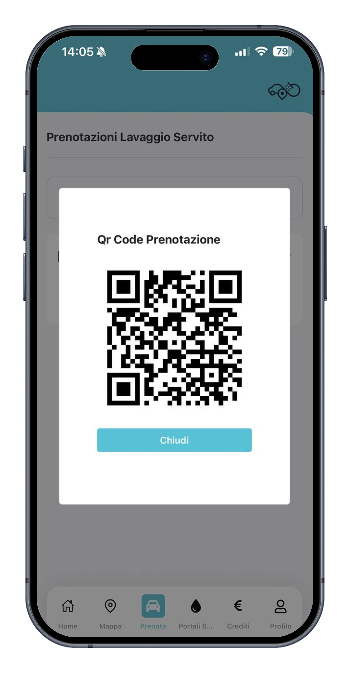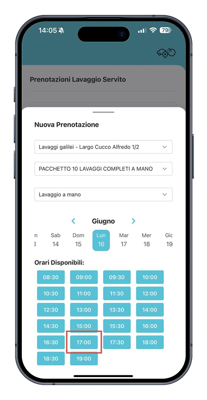 Clicca sulla barra di navigazione "Prenota", si aprirà la sezione per prenotare un lavaggio servito. Cliccando su "Prenota Lavaggio" verrà mostrata la finestra dove inserire le informazioni per la prenotazione.