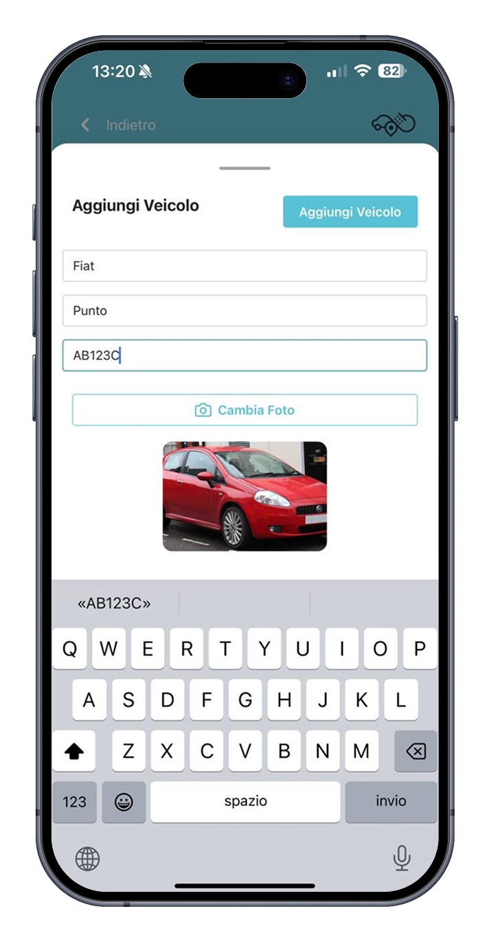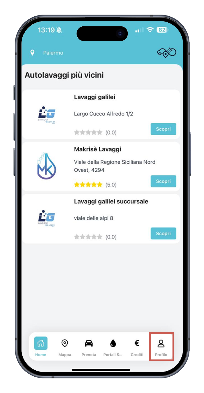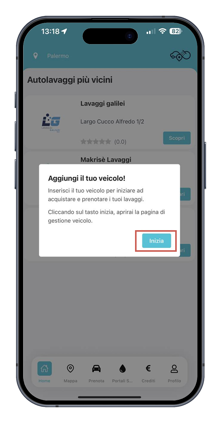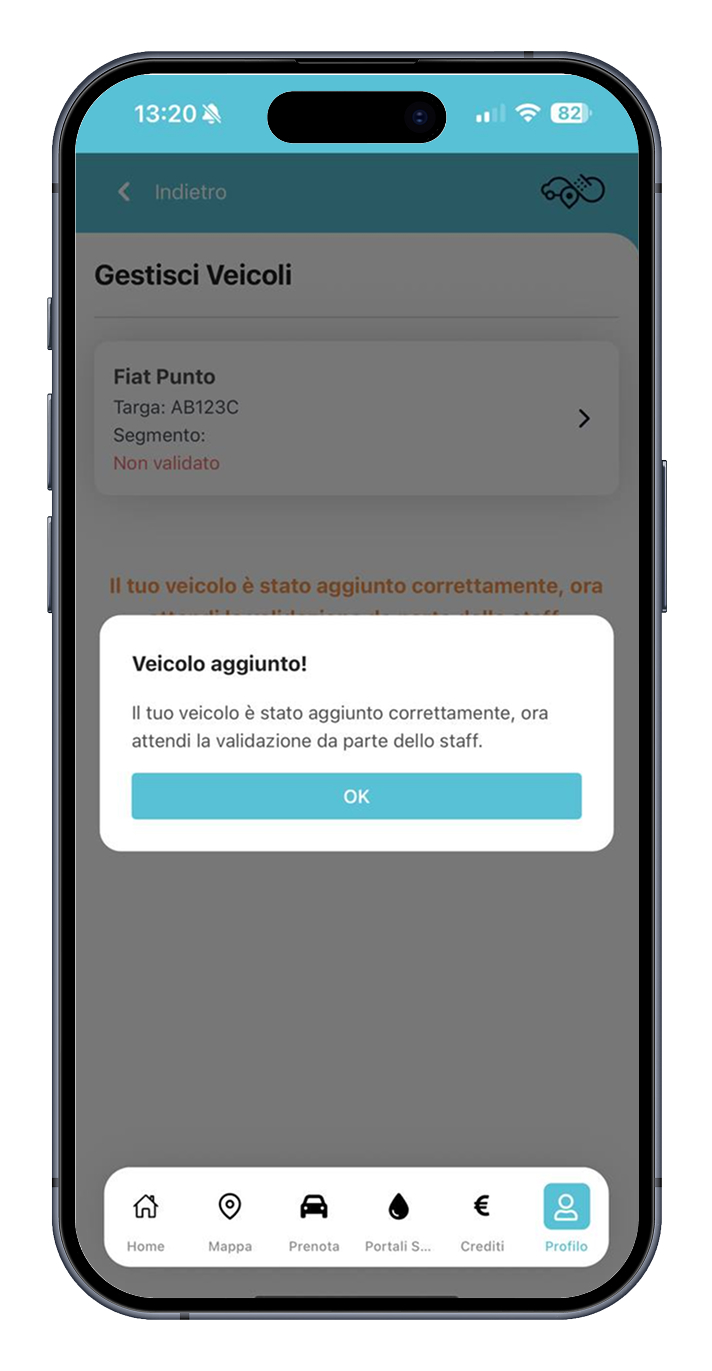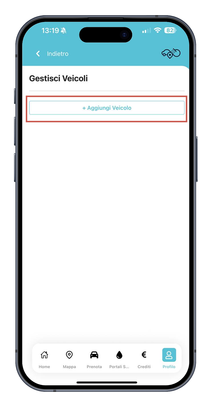 Al primo accesso potrai cliccare sul tasto inizia e l'app ti porterà direttamente alla sezione profilo. Oppure se non hai aggiunto il veicolo ma sei al tuo secondo accesso, clicca su profilo. Una volta aperto il tuo profilo clicca su "I tuoi veicoli".