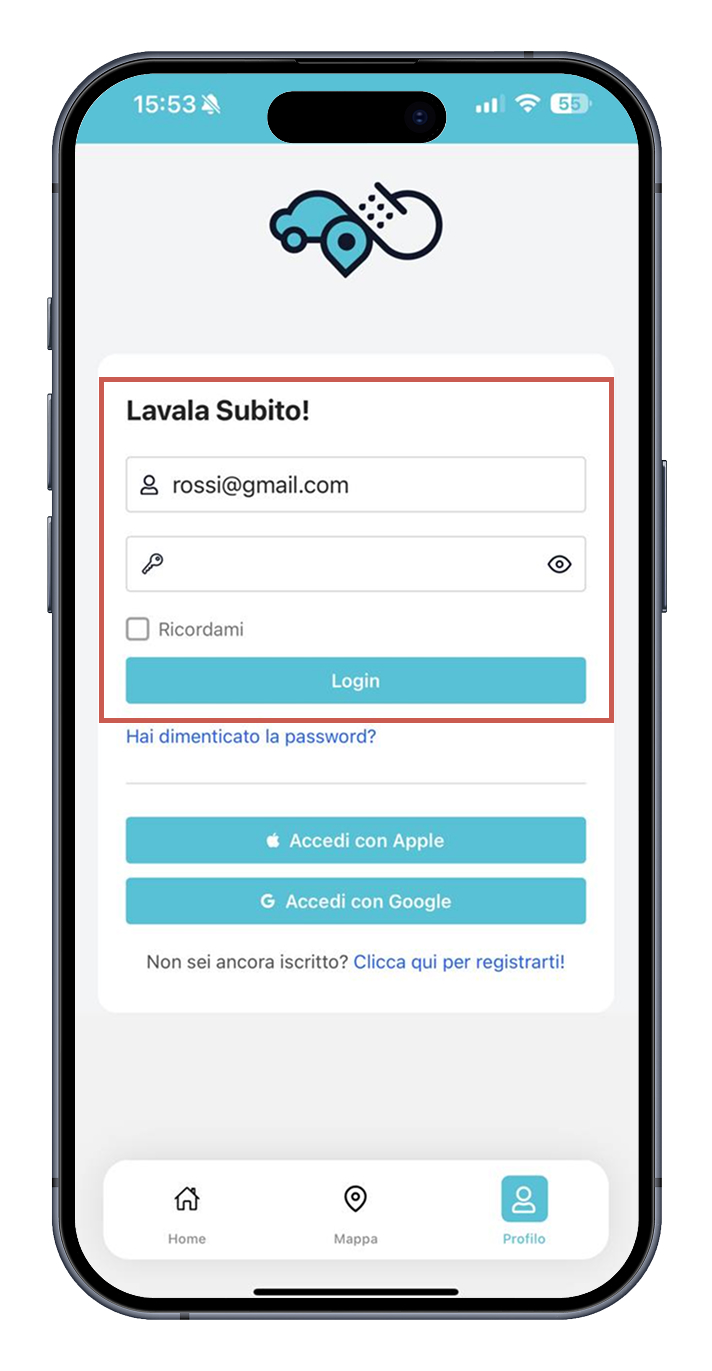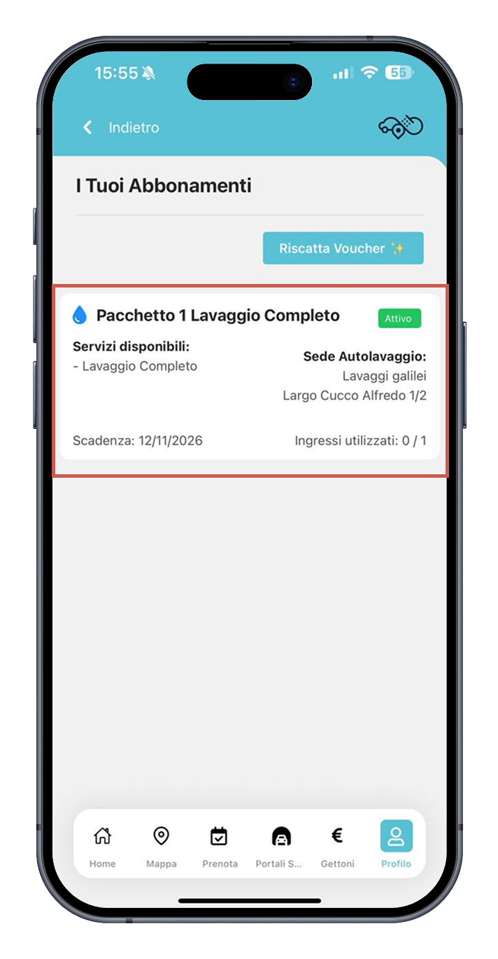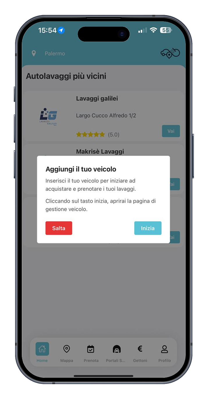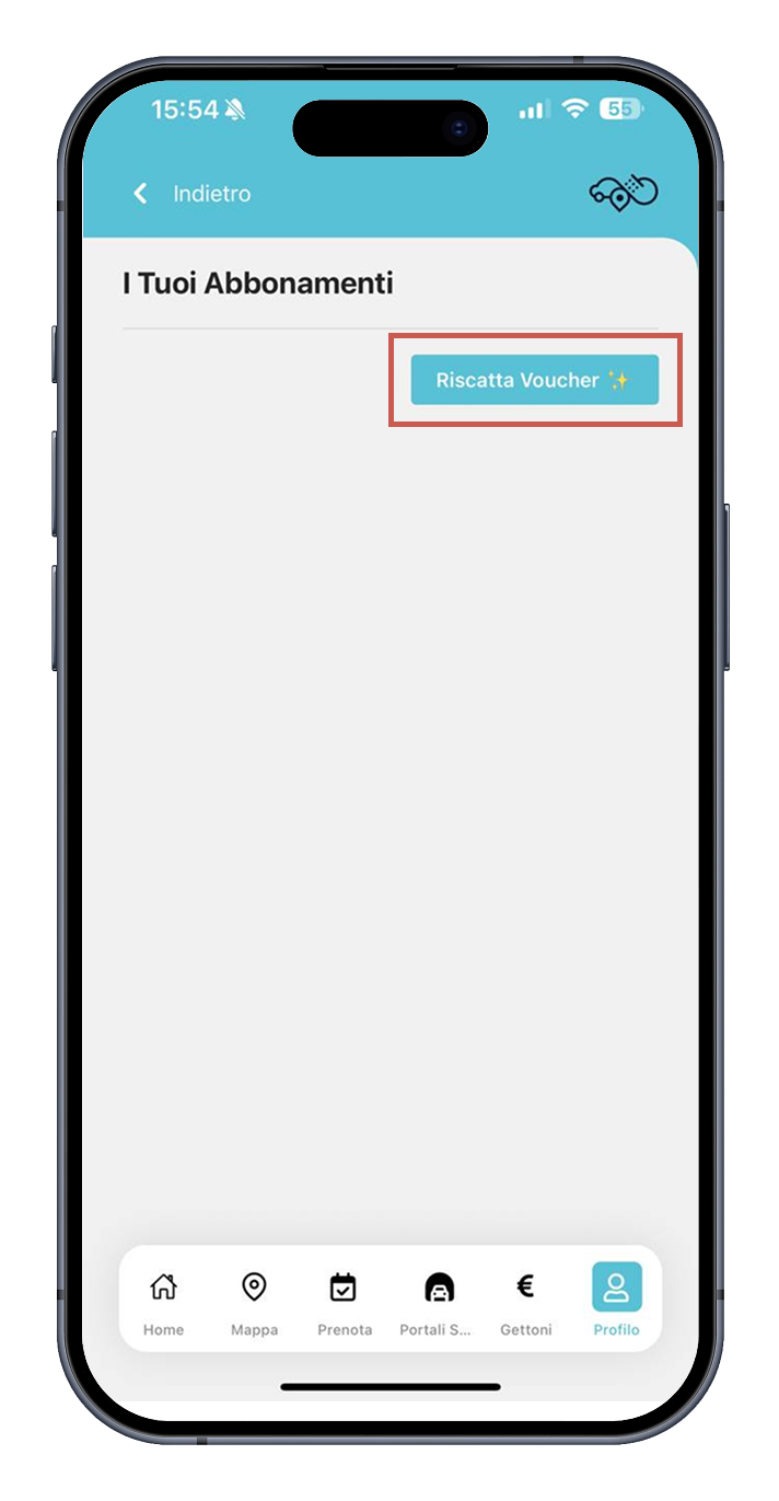Al primo accesso potrai cliccare sul tasto inizia e l'app ti porterà direttamente alla sezione profilo. Oppure se non hai aggiunto il voucher ma sei al tuo secondo accesso, clicca su profilo. Una volta aperto il tuo profilo clicca su "I tuoi veicoli".